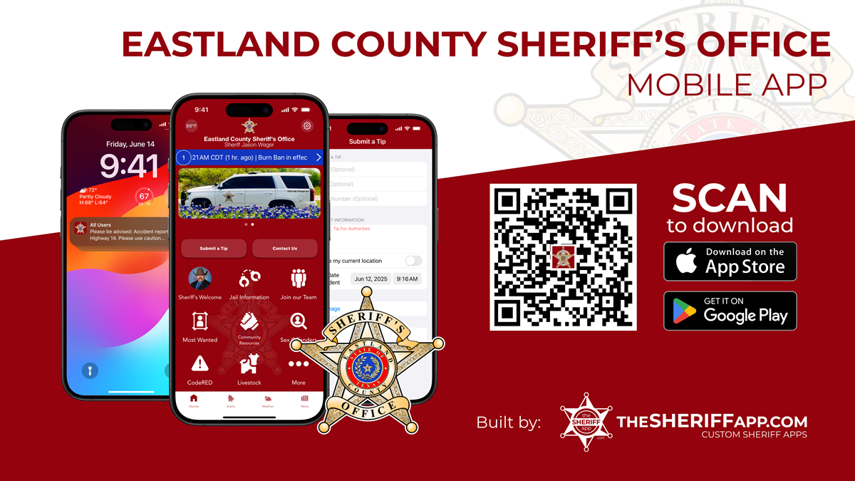 Money for inmate commissary may be sent by cashiers check or money order to 201 W. White, Eastland, TX 76448, addressed to the inmate. Or you may bring it in to the office from 8 a.m. - 12:00 noon, or 1 p.m. - 5 p.m., Monday through Friday.