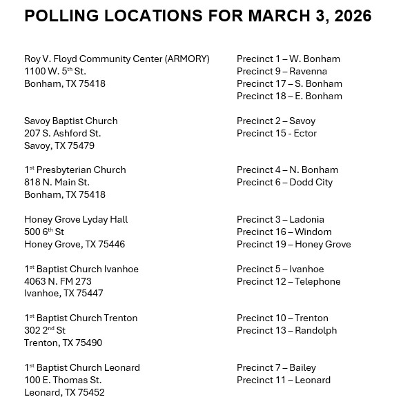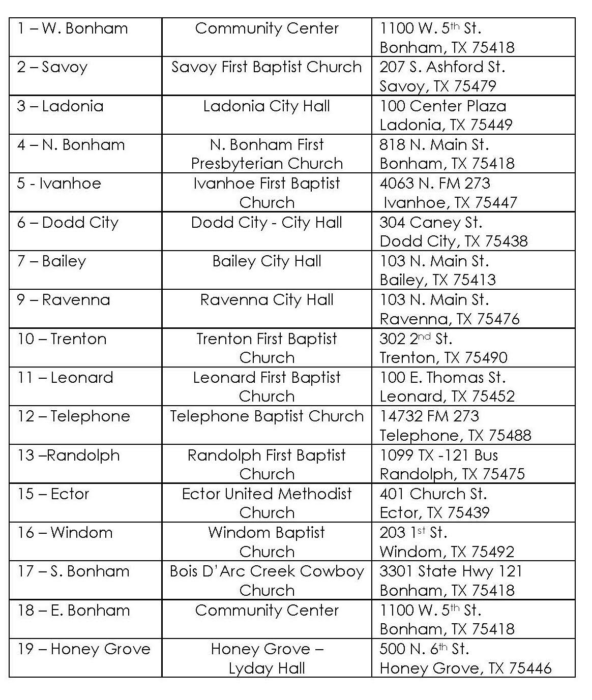 Precinct 1- West Bonham - Roy V. Floyd Civic Center (Armory) -1100 W. 5th St, Bonham, TX Precinct 2- Savoy - First Baptist Church- 207 S. Ashford, Savoy, Texas 75479 Precinct 3- Ladonia - City Hall- 100 Center Plaza St. Ladonia, Texas 75449 Precinct 4- North Bonham - First Presbyterian Church- 821 N. Center, Bonham, Texas 75418 Precinct 5- Ivanhoe - First Baptist Church- 4063 N F M 273, Ivanhoe, Texas 75447 Precinct 6- Dodd City - City Hall- 304 S. Caney, Dodd City, Texas 75438 Precinct 7- Bailey - City Hall, 114 N. Main Street Bailey, TX 75413 Precinct 9- Ravenna/Mulberry - Ravenna City Hall 103 N. Main Street, Ravenna, Texas, 75476 Precinct 10- Trenton - 1st Baptist Church of Trenton, 230 2nd St., Trenton, 75490 Precinct 11- Leonard - 1st Baptist Church, 100 E. Thomas Street, Leonard, 75452 Precinct 12- Telephone - Telephone Baptist Church, 14731 FM 273, Telephone, Texas 75488 Precinct 13- Randolph - First Baptist Church of Randolph, 1099 Business Hwy 121 75475 Precinct 15- Ector - Ector United Methodist Church, 401 Church St., Ector, 75439 Precinct 16- Windom - Windom Baptist Church- 203 First St, Windom, 75492 Precinct 17- South Bonham - Bois d’Arc Cowboy Church, 3301 S. Hwy 121 Bonham , TX Precinct 18- East Bonham - Roy V. Floyd Civic Center (Armory)-1100 W. 5th St, Bonham, TX Precinct 19- Honey Grove – Lyday Hall- 520 6th St. Honey Grove, Texas