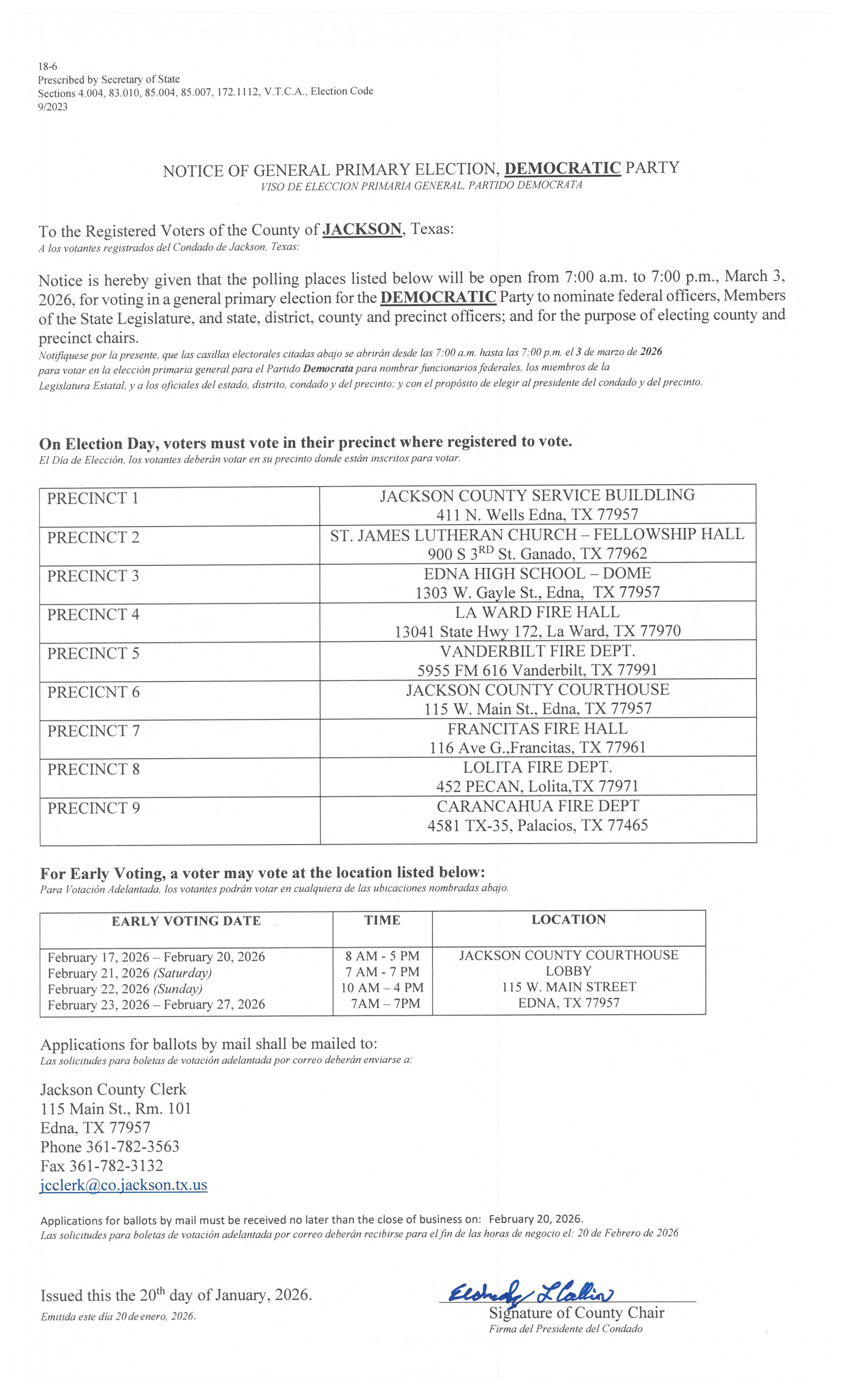 If you plan to go alone to vote curbside, it is wise to call ahead to the Jackson County Clerk's Office @ (361) 782-3563 so election officials will expect you and can give instructions on where to park. Generally speaking, you may vote curbside during the early voting period or on Election Day.