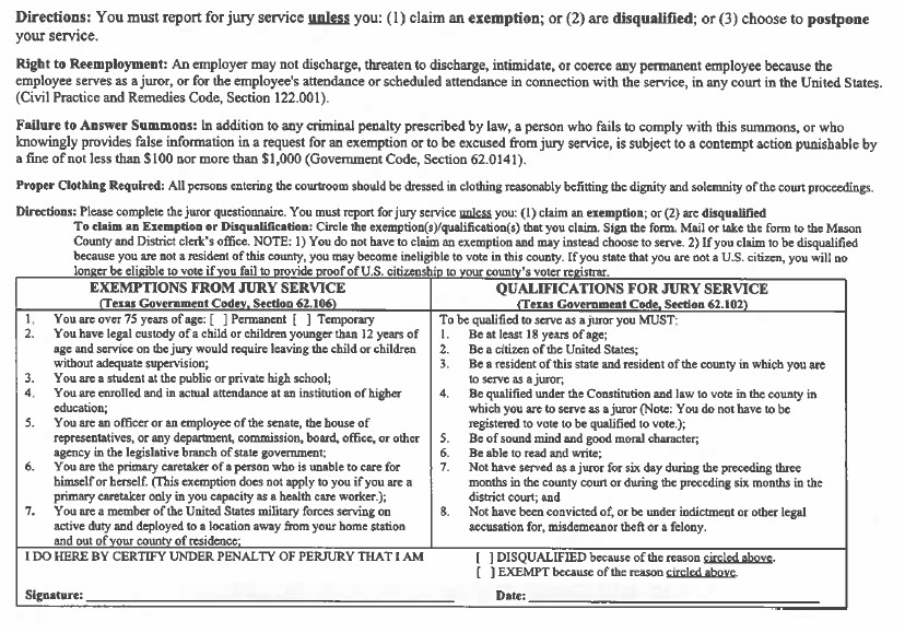 To claim an Exemption or Disqualification, be sure to complete the back of your summons, sign, date and return to the Mason County District Clerk's Office, within 3 days of receiving your summons. To request to postpone your service please call the Mason County District Clerk's office for further instruction.