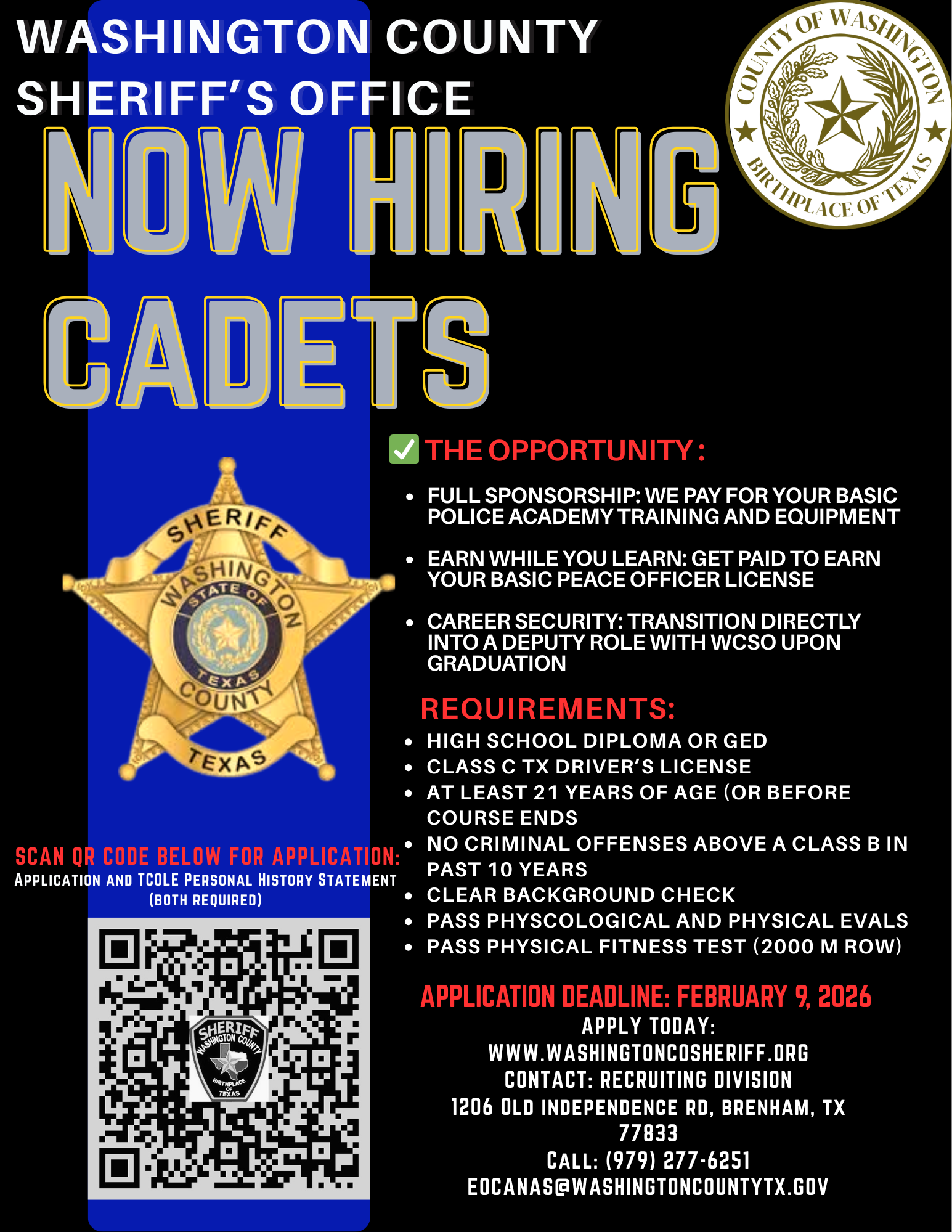 Washington County Employment Application APPLICATIONS ARE RETURNABLE TO Human Resources Office Washington County Annex Building 105 West Main, Suite 101, Brenham, Texas 77833 Phone: 979-277-6236 Fax: 979-277-6210 Email: HR@wacounty.com Equal Opportunity Employer