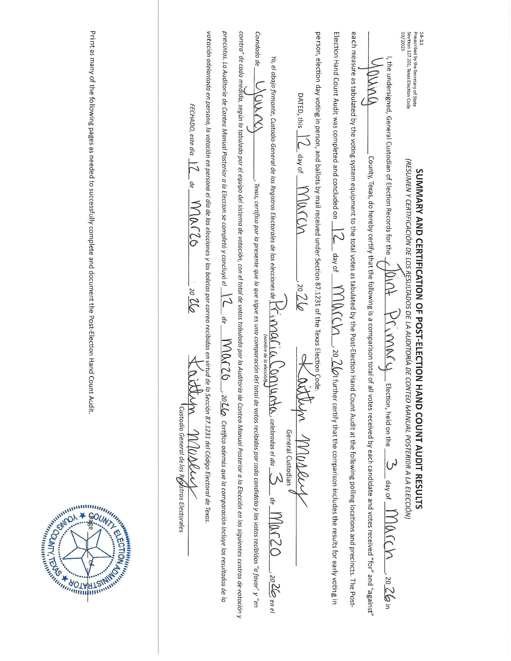 Certification of Post Election Hand Count Audit - 11/4/2025 Constitutional Amendments Notice of Special Election